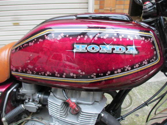 外装フレーク塗装(エアブラシ)、CBウインカー(新品)、メッキヘッドライト、別体マスター、ダブルディスク、タイヤGT601(前後新品)、テクニカルアジャスター、オオカワ三段シート(60cm)、380テール、BEET管(タイプ)、前後新品メッキフェンダー、などなど